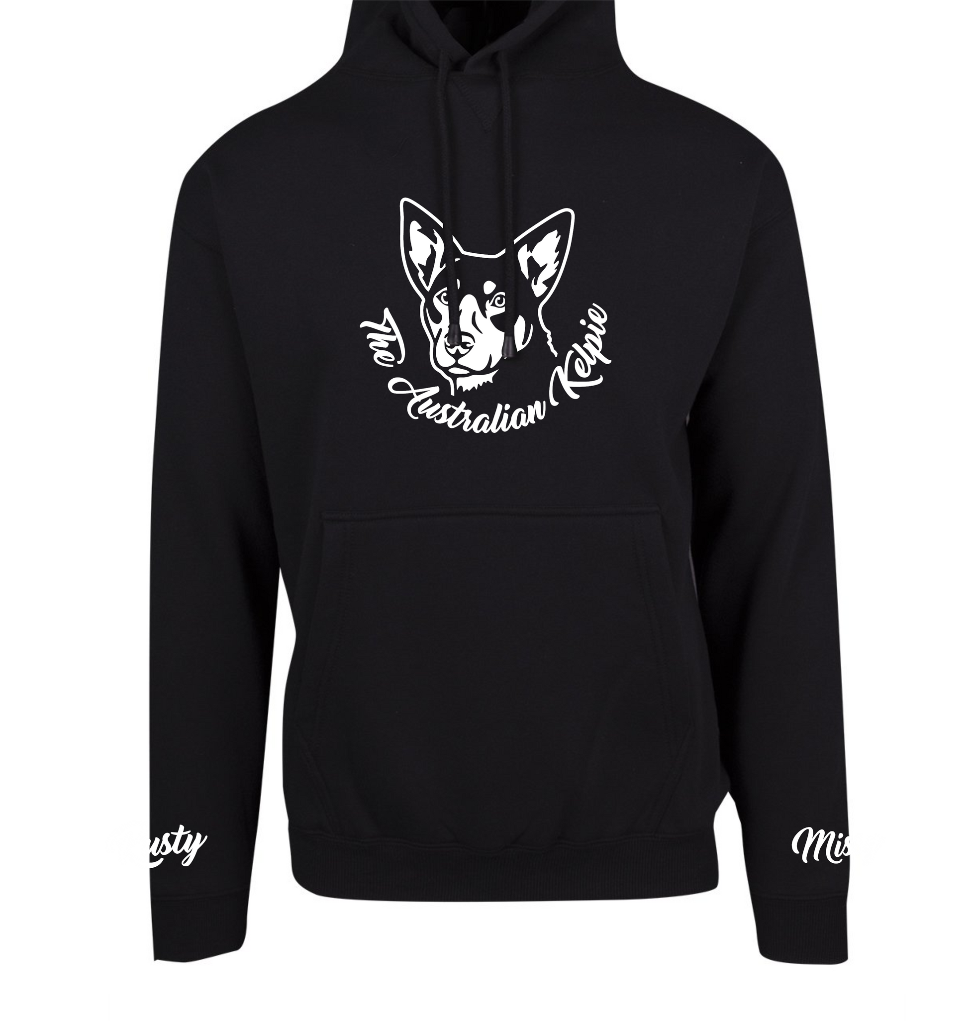 Black hoodie with Australian Kelpie Design and custom names on sleeves in white.